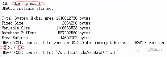 分析启动报错原因:参数文件记录的数据库版本和控制文件记录的数据库版本不一致,原库版本是10.2.0.3.0,但是拷贝过来的数据库软件属于10.2.0.4.0,没有时间再去找10.2.0.3.0的安装包了,只能继续恢复了。