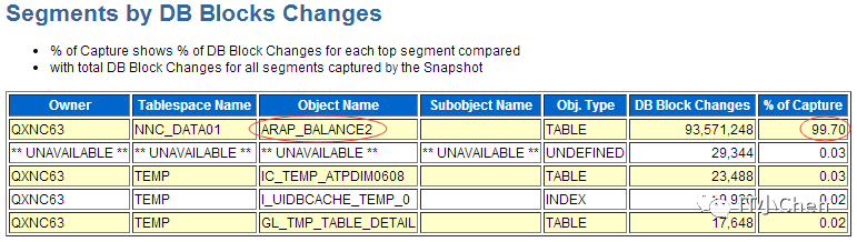 查看AWR报告:发现产生归档的对象主要集中在ARAP_BALANCE2对象上。
