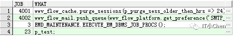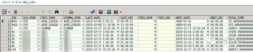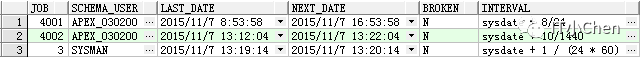 select job,schema_user,last_date,next_date,broken,interval from dba_jobs;