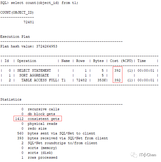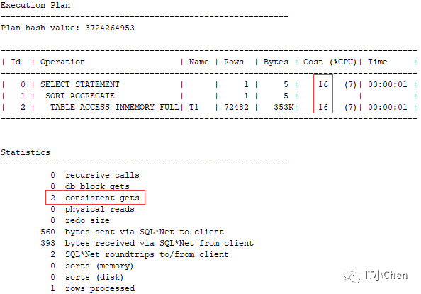 T1表启用inmemory后,consistent gets由1412降到2,Cost由392降到16,性能提升比较明显。