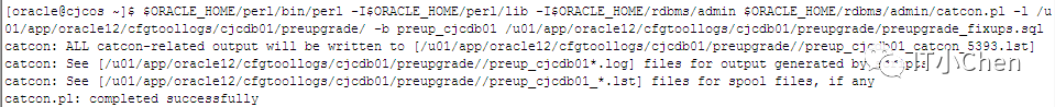$ORACLE_HOME/perl/bin/perl -I$ORACLE_HOME/perl/lib -I$ORACLE_HOME/rdbms/admin $ORACLE_HOME/rdbms/admin/catcon.pl -l /u01/app/oracle12/cfgtoollogs/cjcdb01/preupgrade/ -b preup_cjcdb01 /u01/app/oracle12/cfgtoollogs/cjcdb01/preupgrade/preupgrade_fixups.sql