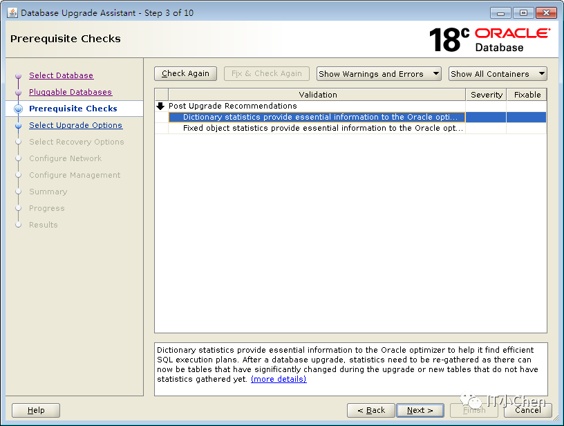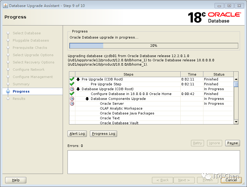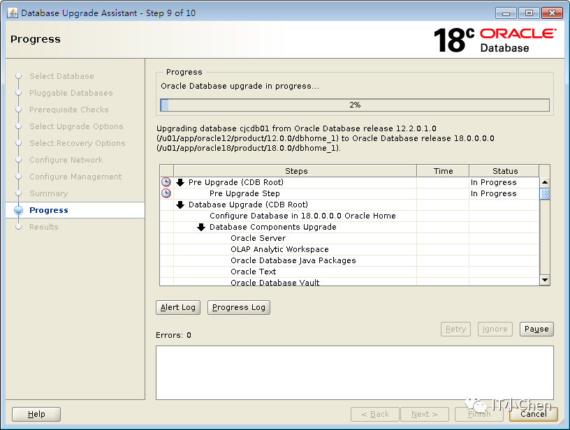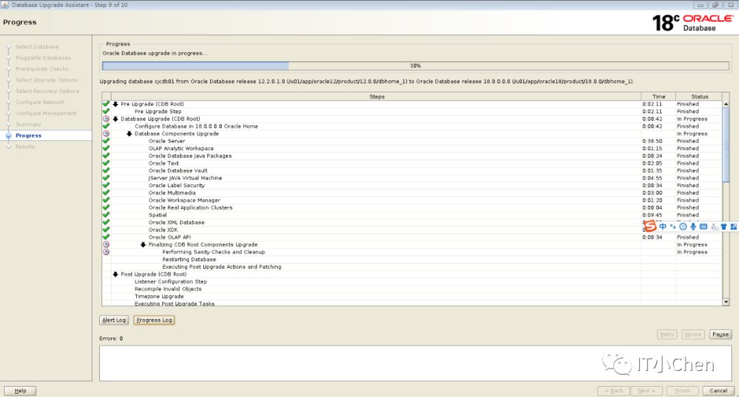 一开始在Oracle Linux Server release 6.3系统上,将11.2.0.4.0升级到12.2.0.1.0正常,再将12.2.0.1.0升级到18.3.0.0.0时,升级任务到70%,会报错ORA-03114: