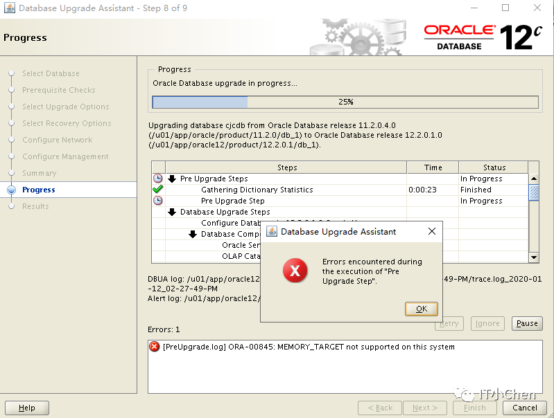 问题原因:检查发现升级过程中产生大量的归档文件,将操作系统根目录占满,导致数据库挂起,无法继续升级;