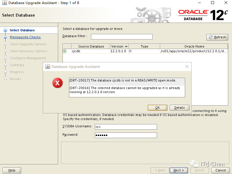 尝试使用DBUA工具重新升级,提示数据库不是读写模式,并且数据库已经是12.2.0.1.0版本了;