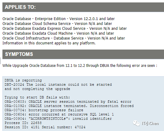 12C:While Upgrading RDBMS Using DBUA Fails with Error "[FATAL] [DBT-20024] Thelocal instance for the specified database "db" could not bestarted" (Doc ID 2304874.1)