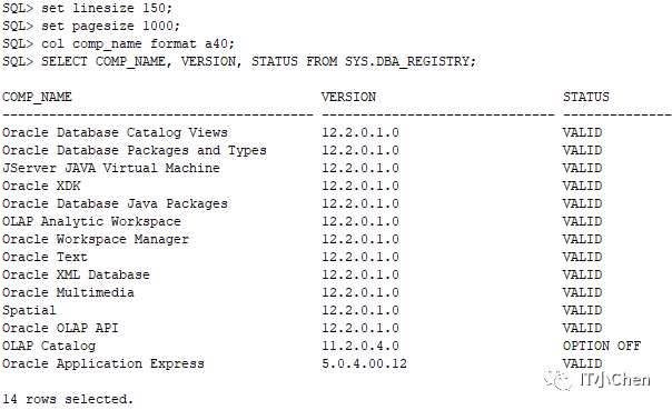 SQL>SELECT COMP_NAME, VERSION, STATUS FROM SYS.DBA_REGISTRY;