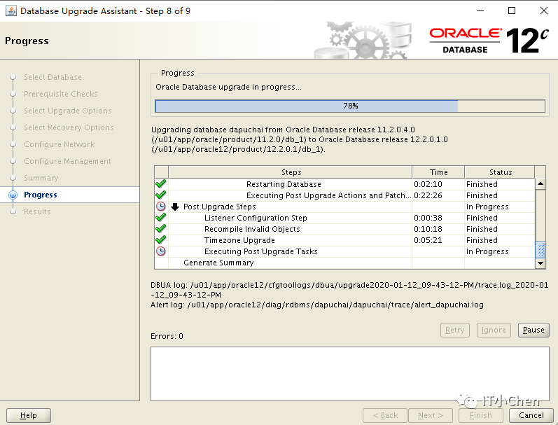 问题原因:检查发现升级过程中产生大量的归档文件,将操作系统根目录占满,导致数据库挂起,无法继续升级;