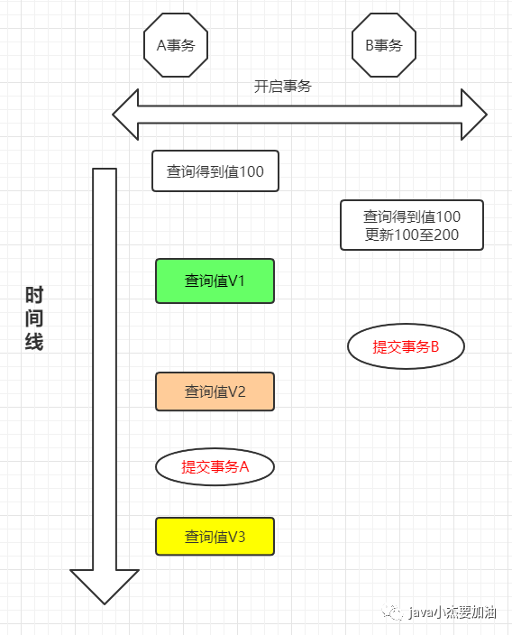 V1 : 100 V2 : 200 V3 : 200 可重复读(RR): A事务多次读取数据,数据总和第一次读取的一样,