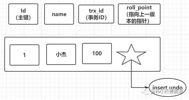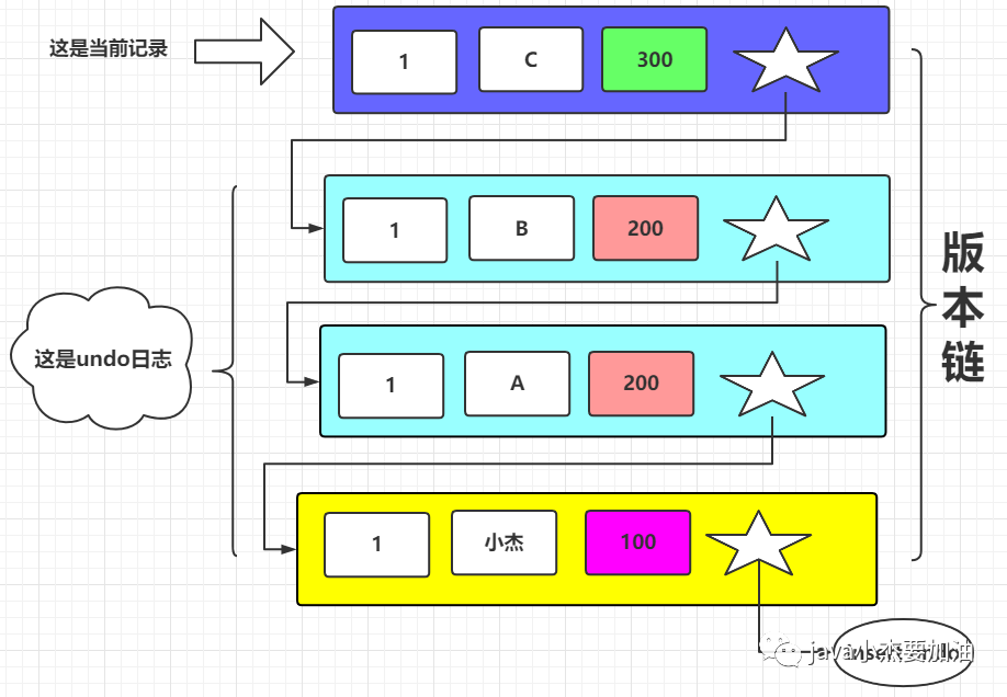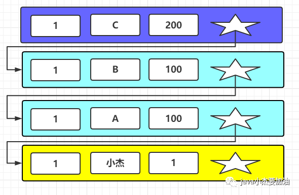 第一条数据是小杰,事务ID为100 事务ID为200的事务将名称从小杰改为了A 事务ID为200的事务将名称从A又改为了B 事务ID为300的事务将名称从B又改为了C