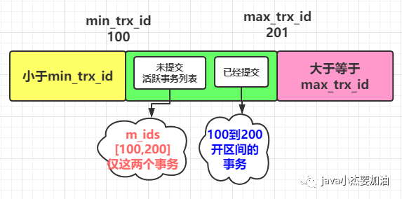 m_ids 是[100,200]: 当前活跃的读写事务的事务id列表 min_trx_id 是 100: m_ids的最小值 max_trx_id 是 201: m_ids的最大值+1