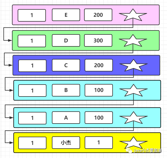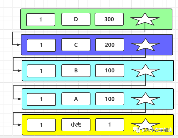 所以串成的链表就是 C -> B -> A -> 小杰 (从最新的数据到最老的数据)