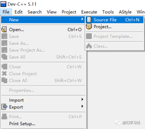 下面,讲解一下如何创建这个程序。双击桌面图标或在开始程序中找到Dev-C++。进入主界面后,在左上角的菜单栏中单击“File”选择“New”再选择“Source File”即可编辑程序了。在编辑好程序后,单击圈出的图标即可(左边的图标意为编译,中间图标意为运行,右侧图标意为编译并运行)。