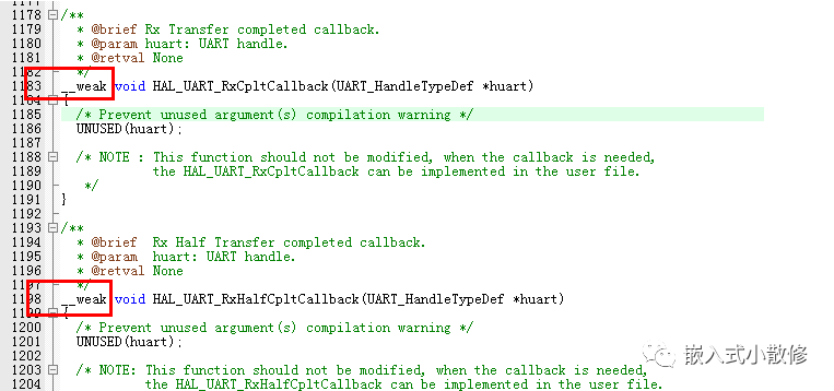 提供的库函数),因为会使用到一些回调函数(比如中断回调函数等),所以需要定义该函数,才能在编译的时候不会报错。但是这些函数一般是开发者要使用,如果直接去软件供应商定义的函数里面实现功能,就会造成文件内容耦合,开发者切换平台或者工程时,做的工作量会更大。