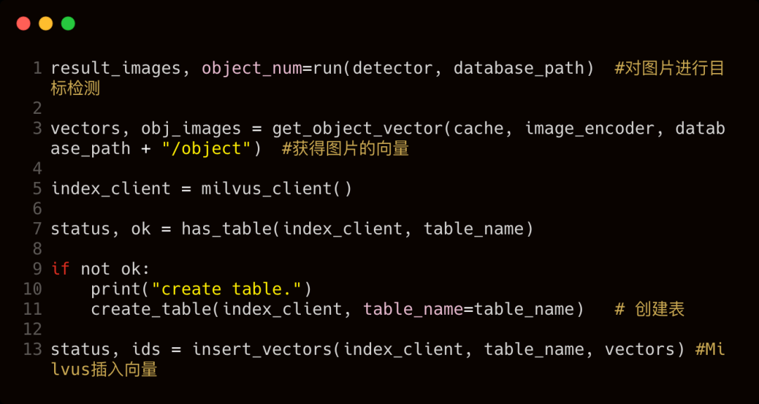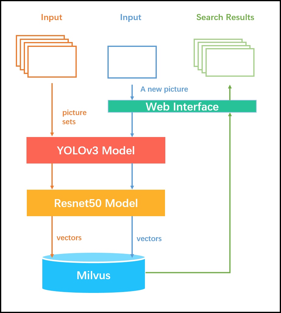 然后,将生成的图片输入到图片识别模型 Resnet50 中,转化为向量并存储到 Milvus 中。Milvus 会对每条向量生成 ID 并建立索引。其后将 ID 和对应的原始图片存储路径存储到 CacheDB 数据库中。