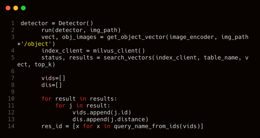 最后,输入一张待搜索的图片,依次进行目标检测和图片识别,并将待搜索图片转化为向量。Milvus 会对向量进行相似度计算并检索出相似图片的 ID ,根据 ID 在CacheDB 数据库中查找对应的图像存储路径,最后将检索结果返回给用户。
