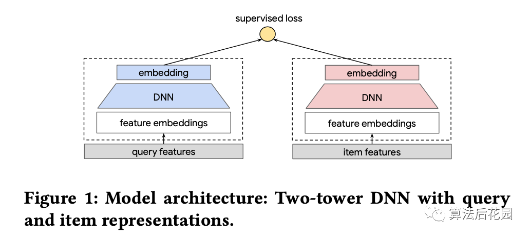 本文的应用场景是什么?本文的应用场景是推荐召回场景,即在给定一个query的情况下,从海量的候选item中找到与query最相关的topN个item,根据query的类型不同,推荐任务也就不同:(1)当query是一个user时,这就是个性化推荐u2i问题;2)当query是一个item时,这就是一个i2i推荐;(3)当query是一个文本时,这就是一个搜索问题。一般解决query2item的问题会使用很受欢迎的双塔DNN模型结构[1],如下图Figure1所示,这种结构会通过有监督学习,将item编码成embedding并进行离线存储,线上服务时,query实时计算得到,query和离线存储的item的embedding进行相似度计算从而找到top-N的item。本文的模型结构基于双塔DNN,给出了解决query2item的一个普适性方案。