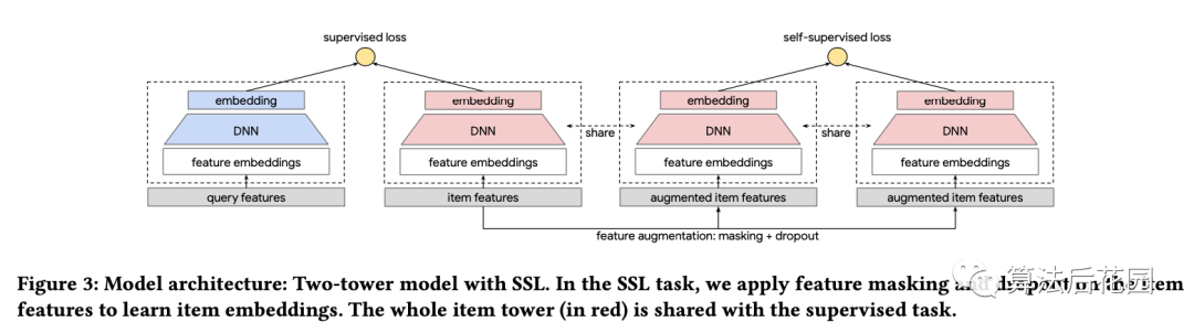 上图中supervised loss对应的双塔是主任务塔,self-supervised loss对应的双塔是辅助任务塔(即SSL任务塔),虚线框的部分就是上文中提到的和,结构是由输入层和MLP构成的,从上图中可以看到,主任务和辅助任务对应的item特征的embedding是共享的,和中与item相关的MLP参数也是共享的。上图中,SSL任务塔的数据增强先后经过了masking和dropout两个阶段。