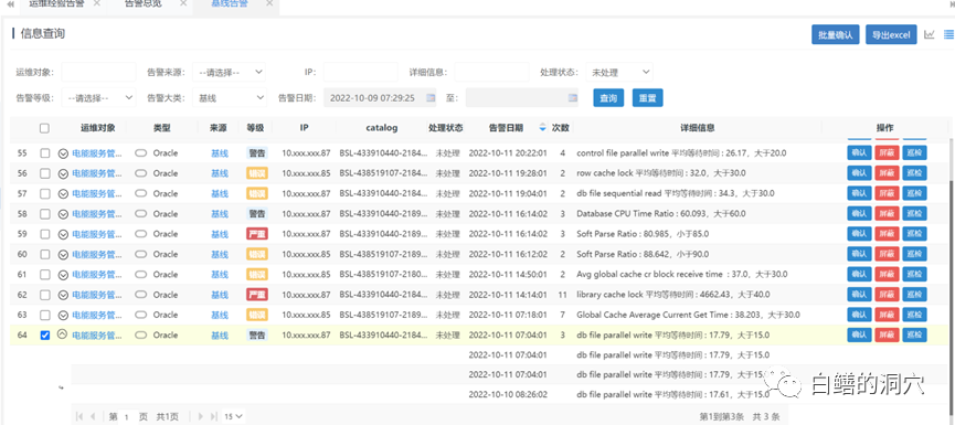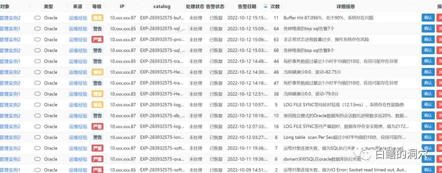 昨天我谈了一个健康管理项目组的案例,现场DBA认为已经找到了解决这个小问题的关键,而实际上隐藏在这个小问题背后还有更大的问题。当时分析这个问题的时候,因为holadata存在一个BUG,无法从企业版D-SMART的分布式模式下下载数据,因此当时的分析仅仅依靠了现场DBA发来的几份问题诊断报告,而并没有全面地去分析数据。缺乏完整数据的情况下,分析问题和发现问题依靠的更多是经验,我对Oracle LOGON过程以及LOGON AUDIT过程的准确理解是我能够在不经意间发现这个隐患的关键。昨天也有朋友给我留言说,通过监控,完全可以发现IO链路抖动的问题。实际上也并不一定是如此的。因为很有可能某个故障发生的持续时间只有1-2分钟,而且故障发生的频率也不高,而监控往往都是采样而不是持续性的,持续性的采样只能从内核来实现,成本太高,已经不属于监控范畴而属于TRACE了。TRACE的成本是极高的,不大可能在一般系统中开启。而基于采样的监控,对于低频发生问题的发现是存在一定概率的逃逸的,因此低频问题的监控,我们需要从多个侧面来进行问题发现。从该问题可能影响以及带来的多种迹象中,只要能够抓住一种,触发告警,从而促进问题的发现,就达到监控的目的了,并不一定要追求直接命中问题。从holadata发来的数据看,在11号7点左右故障发生期间,基线告警是存在几次db file parallel write延时过高的告警的,不过并不严重。因为安全管控问题,最近系统调整了权限,关闭了所有OS采集的权限,因此系统没有采集操作系统IO延时情况,也没有采集操作系统的日志,所以仅凭这个告警还是无法定位问题的。而且基线告警的数量庞大,作为告警来使用,那么运维人员每天就不用干别的,所有时间都来看告警,十来个DBA也干不过来。因此此类的无效告警实际上对运维是没有太大价值的。我们一般都只关注故障模型的告警。从9号到现在的数据来看,系统产生的严重告警数量并不多,和链路故障有关的告警主要有“运维对象连接失败”、“LOG FILE SYNC延时过高”、“非正常状态进程数量过多”这几个告警了。