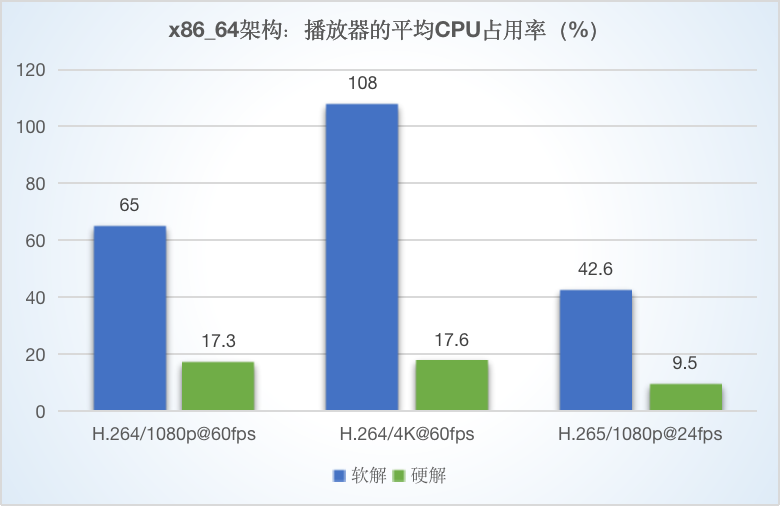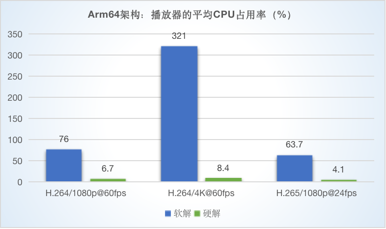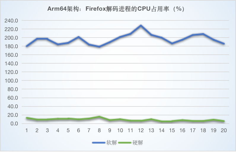 在虚拟机内使用MPV播放器分别播放不同编码标准和清晰度的视频文件时,使用VirtIO-GPU硬件解码时的CPU占有率明显低于软件编解码,在Arm架构上降幅则超过90%,在x86_64架构上降幅超过70%,大幅提升了用户的使用体验。