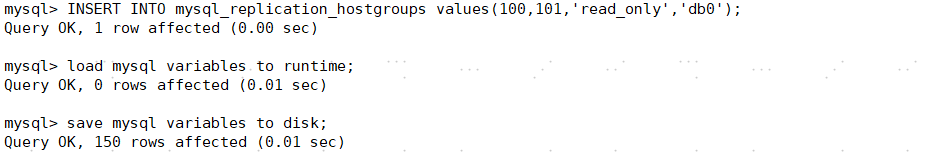insert into mysql_servers(hostgroup_id,hostname,port,weight,comment) values(100, '192.168.56.101', 3306, 1, 'db0,ReadWrite'),(101, '192.168.56.102', 3306, 1, 'db0,ReadOnly');