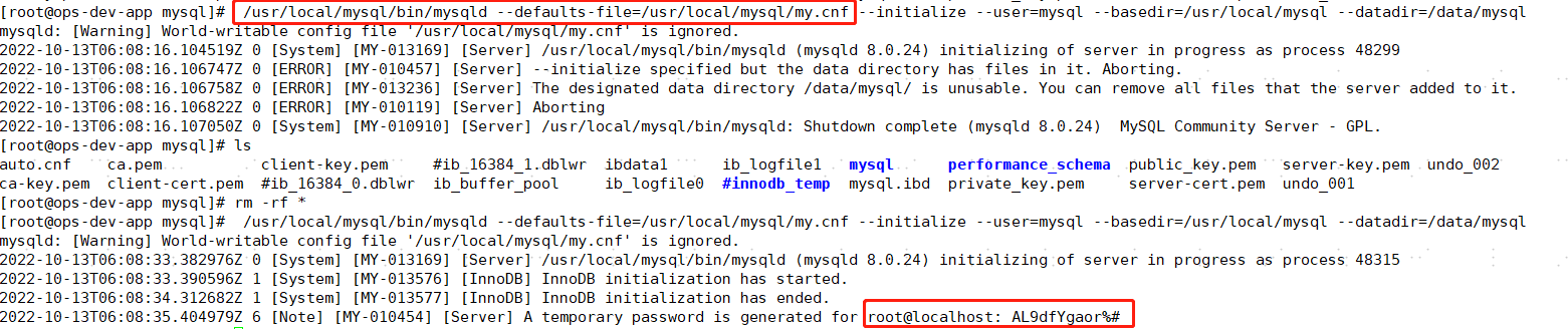 /usr/local/mysql/bin/mysqld --initialize --defaults-file=/usr/local/mysql/my.cnf --user=mysql --basedir=/usr/local/mysql --datadir=/data/mysql # mysql初始化,