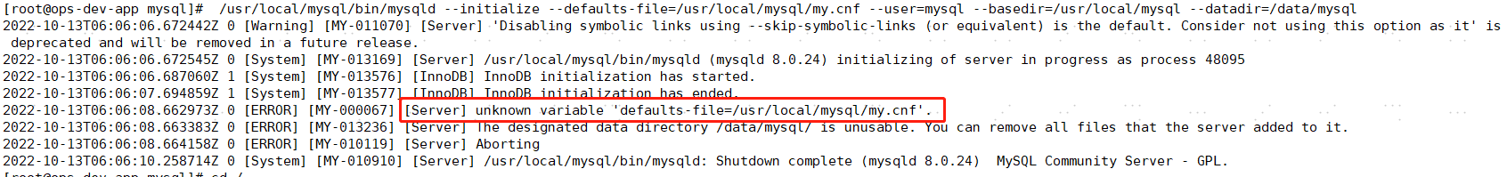 执行初始化报错,看了八遍并没有发现写错了,网上搜索了下发现,这个defaults-file必须放到mysqld的后面,而且必须紧跟在后面,放在其他任何地方都不行。