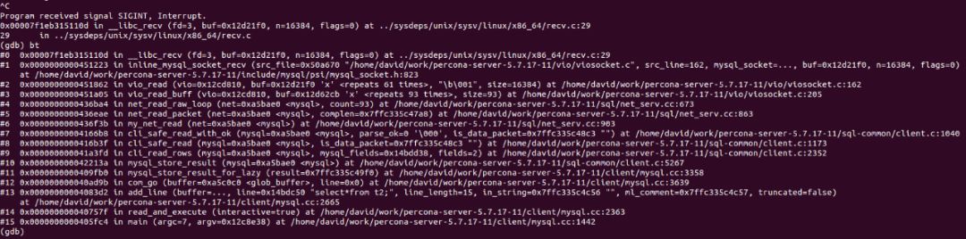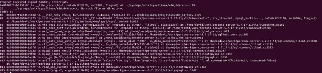 At server side prepare a table my_big_table with a huge amount of data, and set global and session net_write_timeout=1. And to imitate a network congestion that surely happens, we have to use gdb to block the execution of mysqld and client mysql at the right place. Use gdb to attach to the mysqld process and set a breakpoint at function vio_write() and vio_io_wait().Then in the client, issue a ‘select * from my_big_table’, and almost immediately use gdb to attach to the client mysql process, then you will most probably be blocked at such a callstack, and keep it blocked.