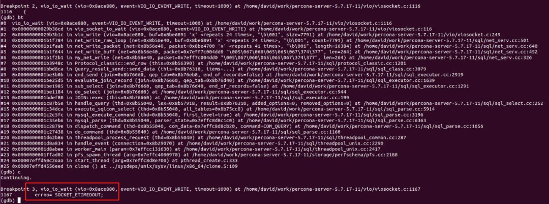 Then in the gdb attached to mysqld process, you will meet many breakpoint hits in vio_write() (server sending result packets to client) and then finally you will see vio_io_wait() (send() would block because OS socket write buffer is full) is called and in vio_io_wait(), this statement is executed in below call stack: