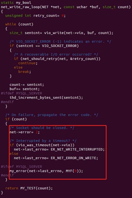 Below is the code of net_write_raw_loop(), if vio_write() fails from timeout it returns VIO_SOCKET_ERROR and the while loop breaks out, and in the red box below, ER_NET_WRITE_INTERRUPTED error is reported, and net->error set to 2. However, neither net->error nor the ER_NET_WRITE_INTERRUPTED error is ever checked or any actions taken(nowhere in the entire code base) .