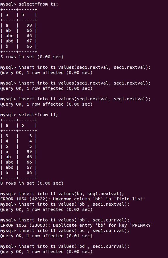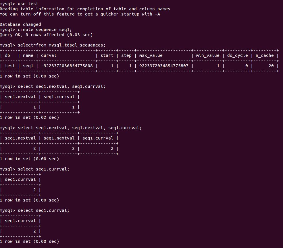 在本文文末我会介绍一下TDSQL sequence的性能,下面我先把sequence的常用功能的执行截图贴出来供读者参考。