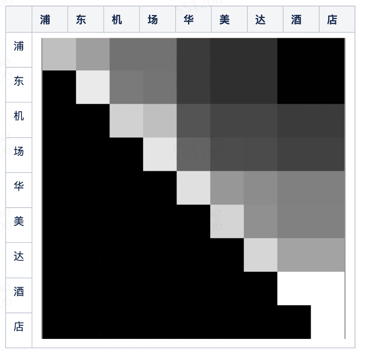 上述业界已有算法的三个指标,根本来源的特征只有一个,就是词频。在统计学的方法中,通常会把一些简单又关键的统计量以图片的方式展示,比如直方图、箱线图等等,即使没有模型介入,光凭人看,还是能够一眼做出正确的判断。可以把语料切出所有长度限定的片段,把片段的词频归一化为0-255,映射为二维矩阵,行表示起始的字符,列表示终止的字符,一个像素点就是一个片段,像素点的明暗程度就是这个候选词片段的热度。