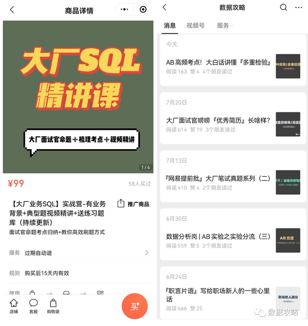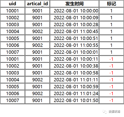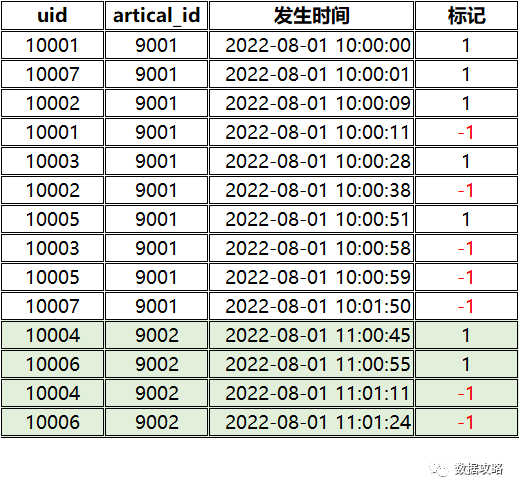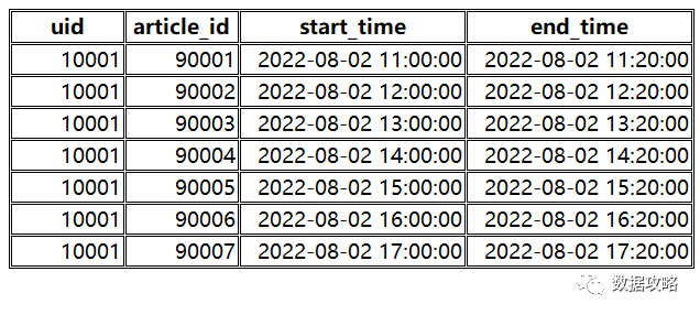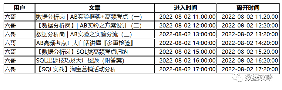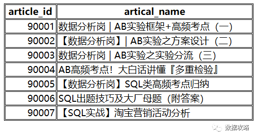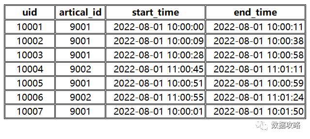 DROP TABLE IF EXISTS artical_log;CREATE TABLE artical_log (uid INT COMMENT '用户ID',artical_id INT COMMENT '文章ID',start_time datetime COMMENT '进入时间',end_time datetime COMMENT '离开时间');INSERT INTO artical_log(uid, artical_id, start_time, end_time) VALUES(10001, 9001, '2022-08-01 10:00:00', '2022-08-01 10:00:11'),(10002, 9001, '2022-08-01 10:00:09', '2022-08-01 10:00:38'),(10003, 9001, '2022-08-01 10:00:28', '2022-08-01 10:00:58'),(10004, 9002, '2022-08-01 11:00:45', '2022-08-01 11:01:11'),(10005, 9001, '2022-08-01 10:00:51', '2022-08-01 10:00:59'),(10006, 9002, '2022-08-01 11:00:55', '2022-08-01 11:01:24'),(10007, 9001, '2022-08-01 10:00:01', '2022-08-01 10:01:50');DROP TABLE IF EXISTS artical_info;CREATE TABLE artical_info (artical_id INT COMMENT '文章ID',artical_name varchar(60) COMMENT '文章名称');INSERT INTO artical_info(artical_id, artical_name) VALUES(9001,'数据分析岗 | AB实验框架+高频考点(一)'),(9002,'【数据分析岗】| AB实验之方案设计(二)'),(9003,'数据分析岗 | AB实验之实验分流(三)'),(9004,'AB高频考点!大白话讲懂『多重检验』'),(9005,'【数据分析岗】SQL类高频考点归纳'),(9006,'SQL出题技巧及大厂母题(附答案)'),(9007,'【SQL实战】淘宝营销活动分析');DROP TABLE IF EXISTS user_info;CREATE TABLE user_info (uid INT COMMENT '用户id',uid_name varchar(60) COMMENT '文章名称');INSERT INTO user_info(uid, uid_name) VALUES(10001,'六哥'),(10002,'罗卡'),(10003,'张三'),(10004,'李四'),(10005,'赵五'),(10006,'钱六'),(10007,'高八');