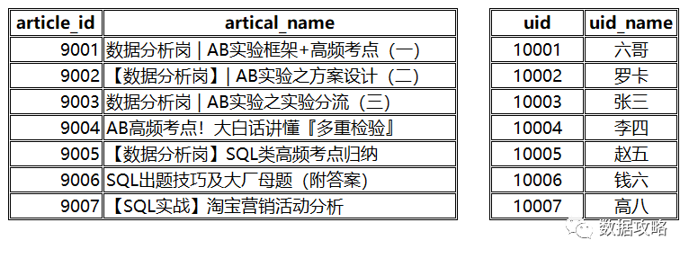 为了查找uid=10001对应的是六哥 articleid=90001对应的是《数据分析岗 | AB实验框架+高频考点(一)》
