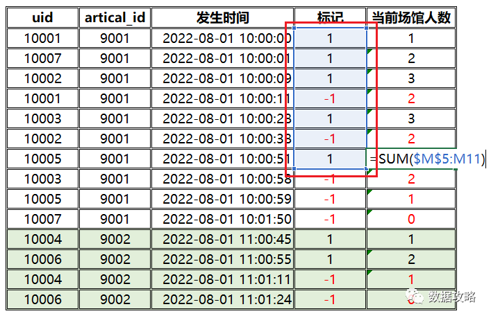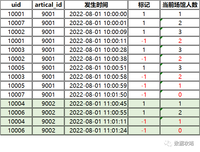 selectartical_id,sum(num) over (partition by artical_id order by log_time asc,num desc) as online_uvfrom(selectartical_id-- 进入时间,start_time as log_time,1 as numfrom artical_logunion allselectartical_id-- 离开时间,end_time as log_time,-1 as numfrom artical_log)a