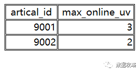 selectartical_id,max(online_uv) AS max_online_uvfrom(selectartical_id,sum(num) over (partition by artical_id order by log_time asc,num desc) as online_uvfrom(selectartical_id-- 进入时间,start_time as log_time,1 as numfrom artical_logunion allselectartical_id-- 离开时间,end_time as log_time,-1 as numfrom artical_log)a)agroup byartical_id