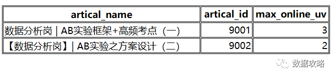 selectb.artical_name,a.artical_id,a.max_online_uvfrom(selectartical_id,max(online_uv) AS max_online_uvfrom(selectartical_id,sum(num) over (partition by artical_id order by log_time asc,num desc) as online_uvfrom(selectartical_id-- 进入时间,start_time as log_time,1 as numfrom artical_logunion allselectartical_id-- 离开时间,end_time as log_time,-1 as numfrom artical_log)a)agroup byartical_id)ainner join artical_info bon a.artical_id = b.artical_id
