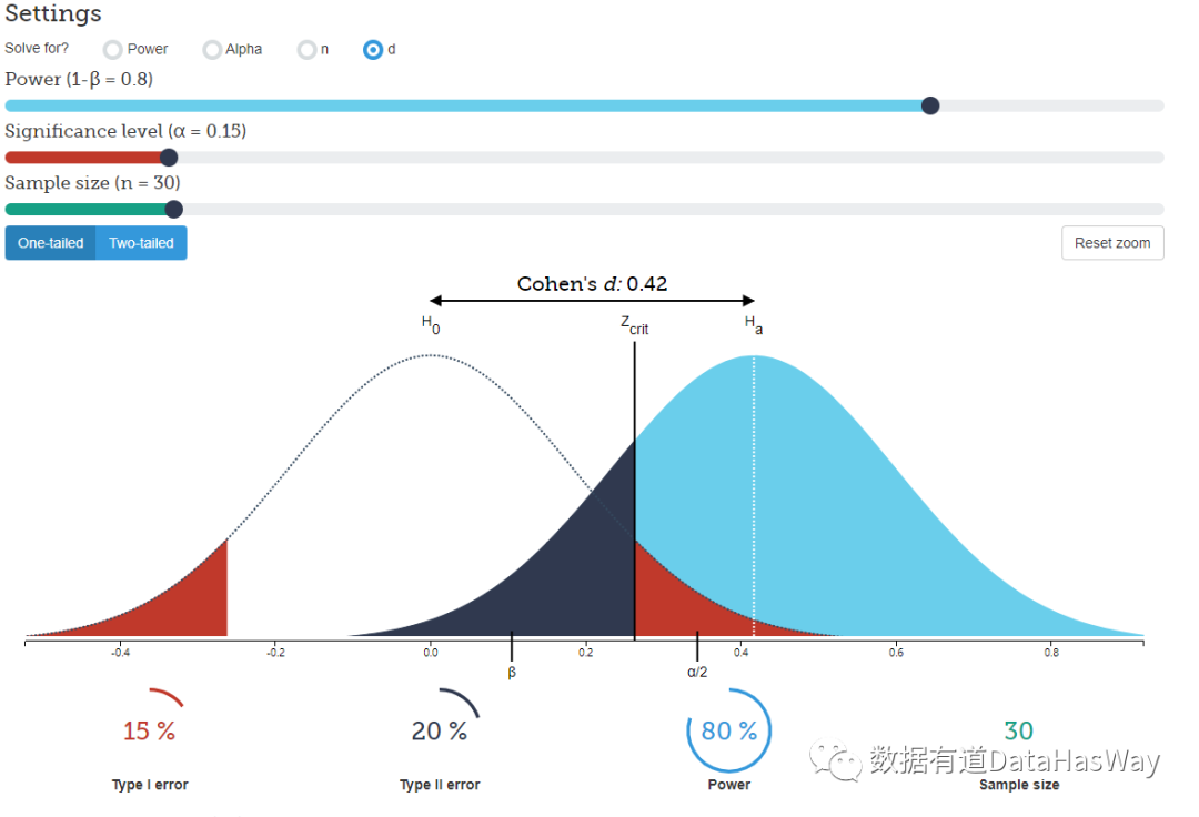 我们一般把统计功效定义在80%(或90%)以上,即β在0.2(或0.1)以下。认为这样的可信度是可以接受的。