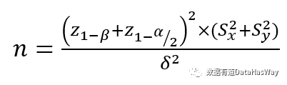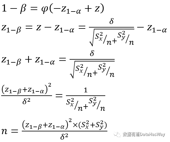 以单边检验为列,进行最小样本量计算,假设两组样本数量相等,均为n ,则最小样本量为: