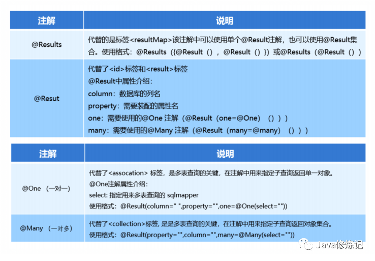 使用注解开发后,我们可以使用 @Results、@Result,@One、@Many 注解组合完成复杂关系的配置。