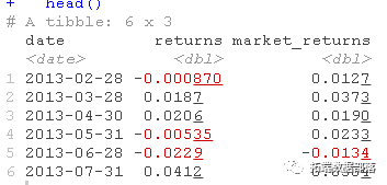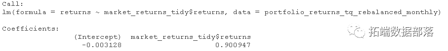 首先,我们将使用dplyr来抓取我们的投资组合贝塔。稍后会进行一些可视化,但现在将提取投资组合的β值。