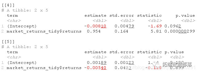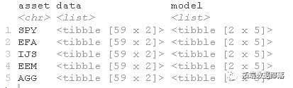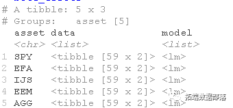 我们现在有三列:之前的资产,之前的数据,以及我们刚刚添加的模型。模型一栏是我们对每项资产进行回归的结果lm( )。这些结果是我们每个资产的β值和截距。