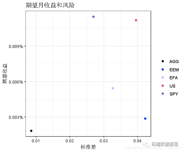 我们的投资组合在这个散点图上的位置如何?让我们用geom_point()把它添加到ggplot()中。
