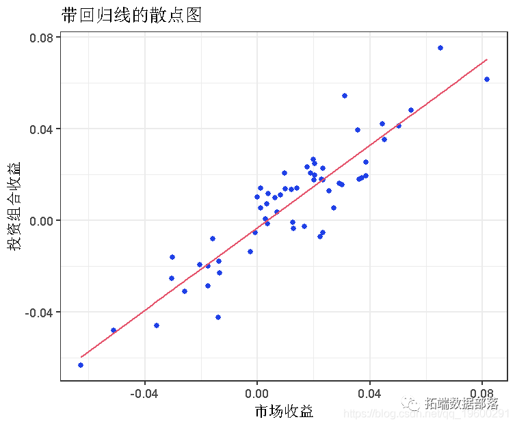 这个散点图与β计算传达了相同的强线性关系。我们可以用geom_smooth()给它添加一个简单的回归线。