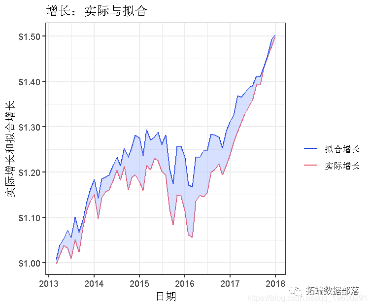 我们的拟合增长很好地预测了我们的实际增长,尽管在大部分时间里,实际增长低于预测值。