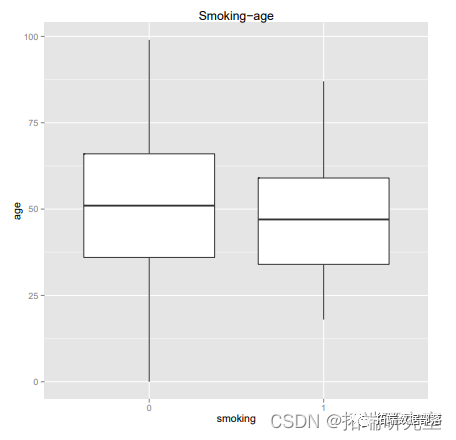 ggplot(smoke\_age,aes(as.factor(smoking),age))+geom\_boxplot()+labs(title="Smoking-age",x="smoking",y="age")