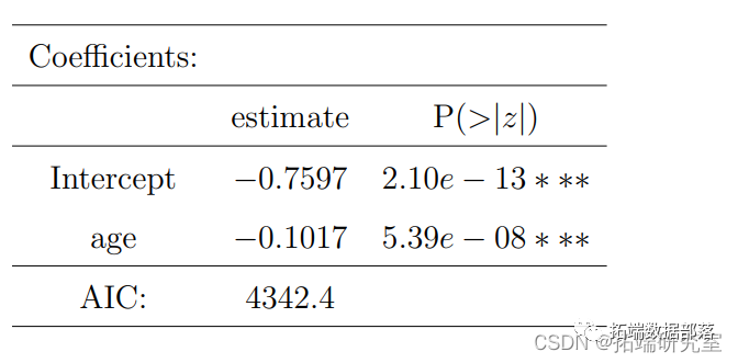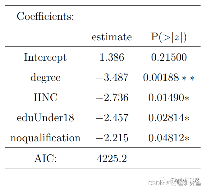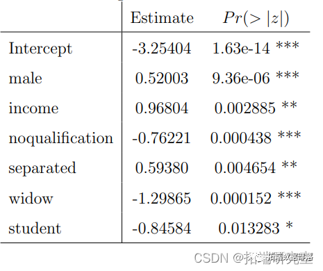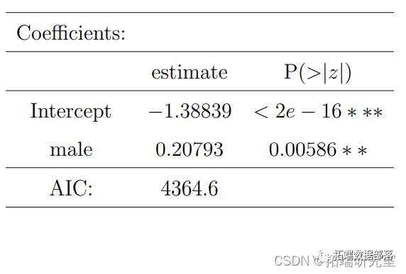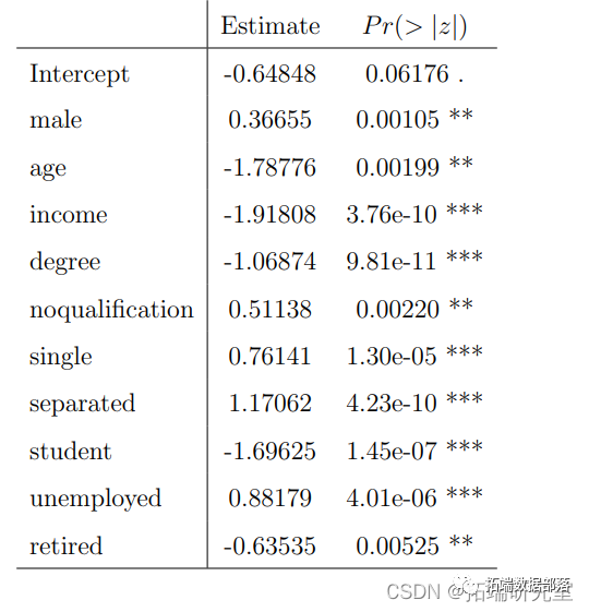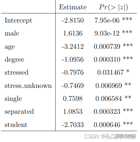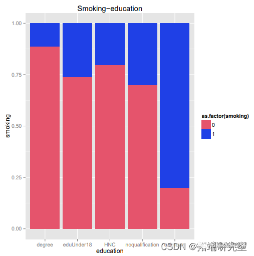 参照图2,1代表吸烟者,0代表不吸烟者。图中显示,男性吸烟者比女性吸烟者多一点,这意味着性别对吸烟偏好有影响。R输出也给出了同样的结论,P值是显著的,男性的估计值为0.20793,这意味着男性更可能吸烟。
