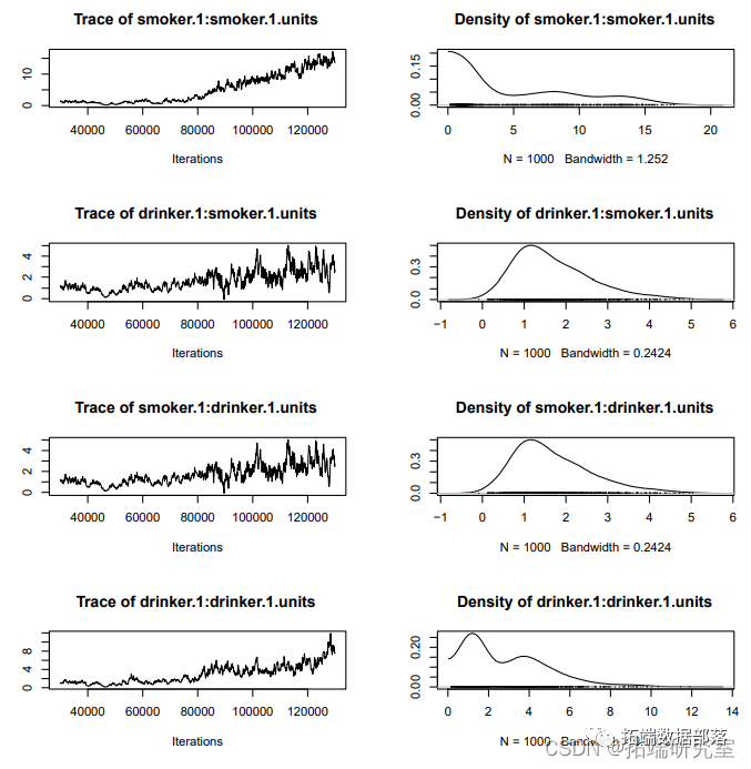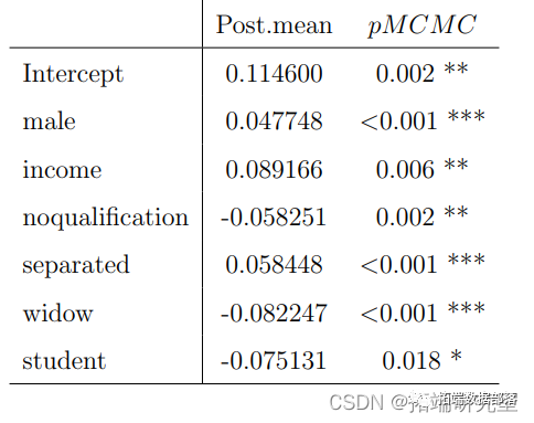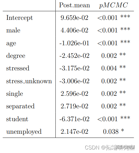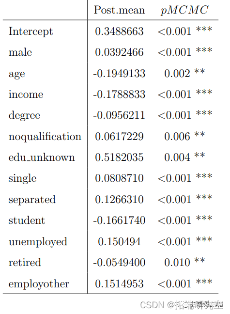 model.smoker<- MCMCglmm(smoker~male+age+income+whiteO+mixed+asian+chinese+african+arasummary(model.smoker)表5中的显著变量与表2非常相似,唯一不同的是,被放弃的变量 "edu unknown "和 "employother "在表5中是显著变量。