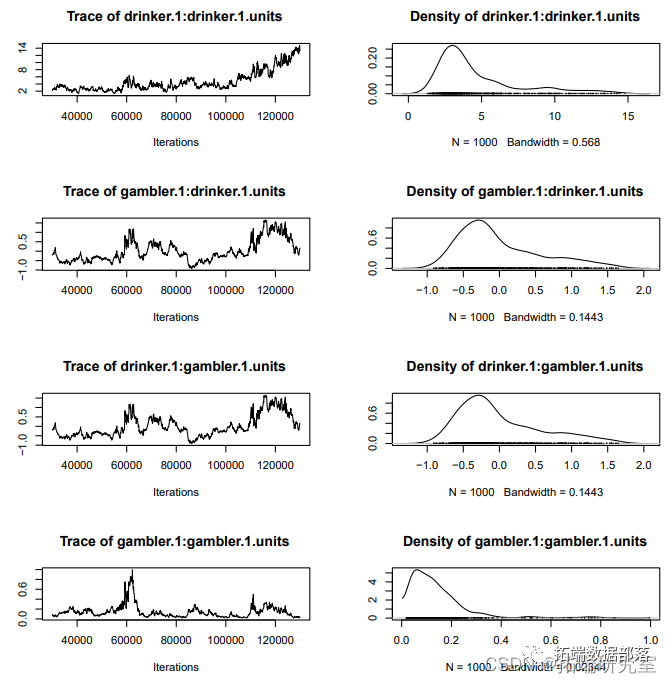 在分析了吸烟者和饮酒者之间的相关性之后,我们现在用双变量的'MCMCglmm'模型来测试吸烟者和赌博者之间的关系船。表9显示了单变量模型的协变量。