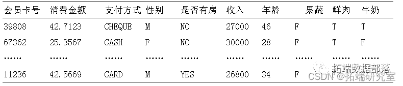 采用了顾客在超市购买的数据进行分析,涉及意大利面、牛奶、水、面包饼干、咖啡、奶油蛋糕、酸奶、冷藏蔬菜、金枪鱼、啤酒、番茄酱、可乐、大米、果汁、咸饼干、油、冰冻鱼、冰淇淋、奶酪、罐装肉多种商品,如果顾客购买了该商品,则记为1,如果没有购买该商品,则记为0。