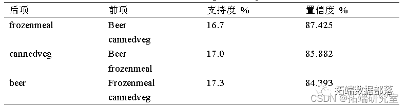 通过Spss Modeler使用Apriori模型对某超市DSS数据的分析,实验结果如表所示,实验产生了三条置信度和支持度最高的关联规则:分别为啤酒和罐头蔬菜→冷冻食品(S=14.6%,C=87.4%);啤酒和冷冻食品→罐头蔬菜(S=14.6%,C=85.9%);冷冻食品和罐头蔬菜→啤酒(S=14.6%,C=84.4%)。同时,三条关联规则的提升值都可以接受。因此,啤酒、罐头蔬菜、冷冻食品是最可能连带销售的商品。因此,在实际销售或者在商品的摆放过程中,可以将这些商品进行捆绑销售。